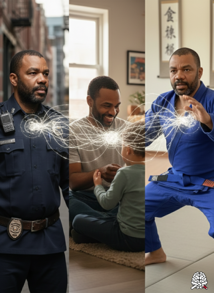 The way you respond under pressure on the mat affects the way you respond under pressure on the street. The way you manage stress at work affects the patience you bring home. The way you use power in uniform shapes the way you use your voice with your partner and children.